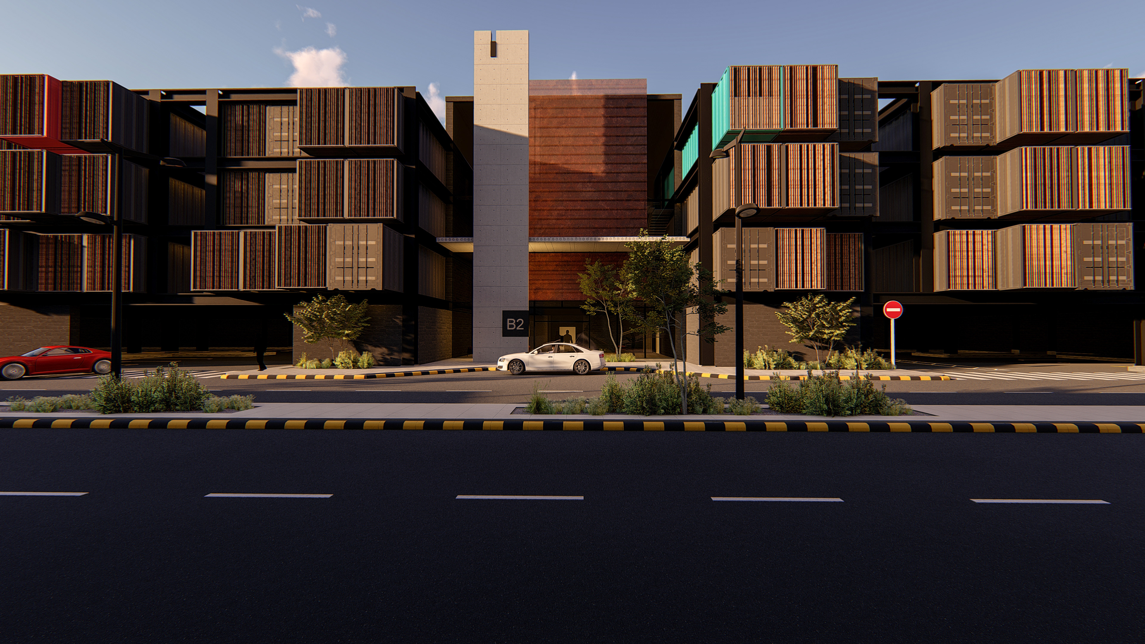 Concept: The steel structure has been relied upon, taking advantage of the abundance of shipping containers and making it the basic unit, forming housing units of different sizes and then inserting them into the steel structure.